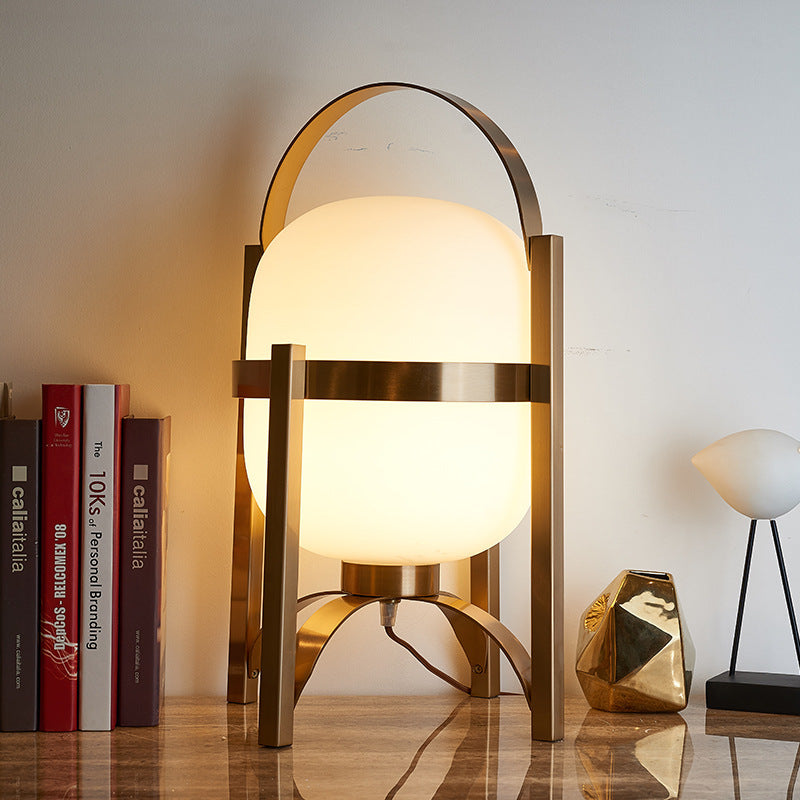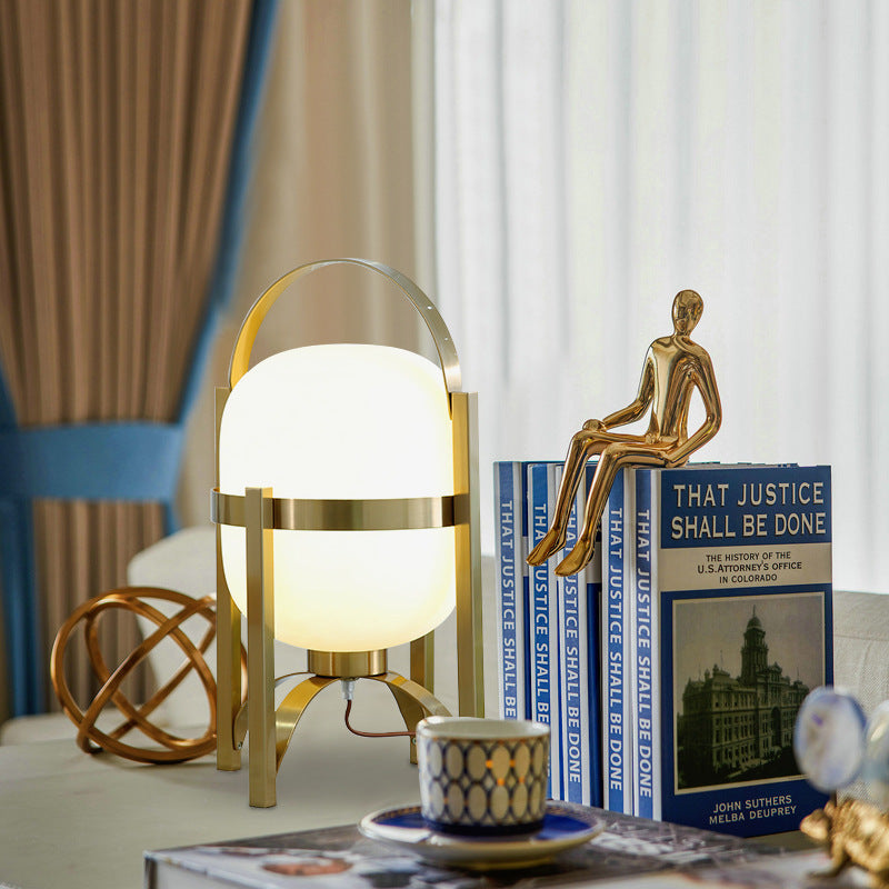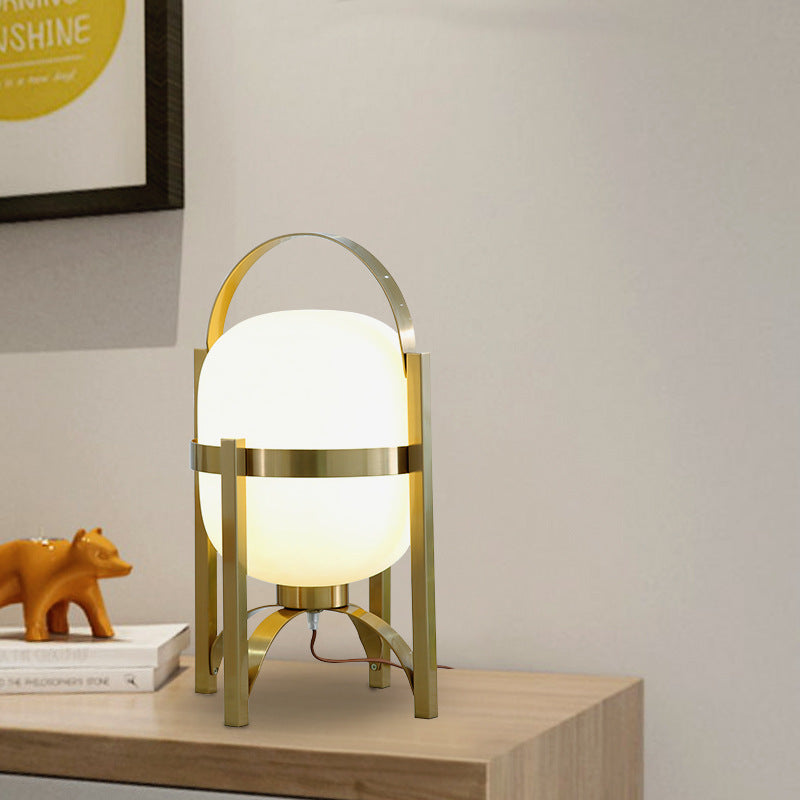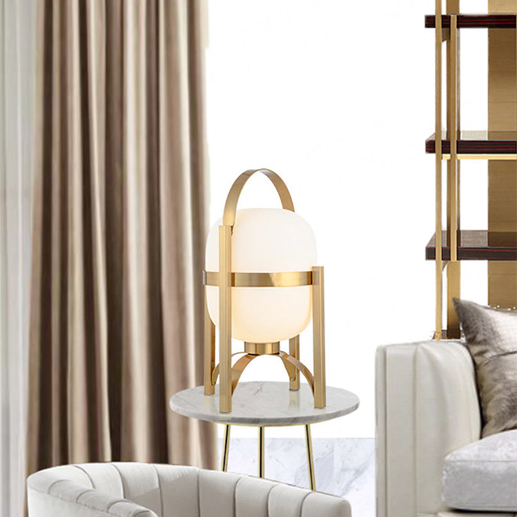 Apportez ambiance et style à votre intérieur avec cette lampe de table postmoderne d'OGS. La lampe combine une température de couleur chaude de 2700K avec un design élégant en fer doré et verre blanc mat. Sa base robuste et son abat-jour iconique en forme de dôme en font un élément qui attire le regard sur les tables de chevet, les tables d'appoint ou les bureaux.